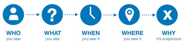 If you SEE SOMETHING suspicious, DO SOMETHING by reporting your observations and details to an authority — law enforcement, venue security, event staff, or a trusted adult. Include as much information as possible.
